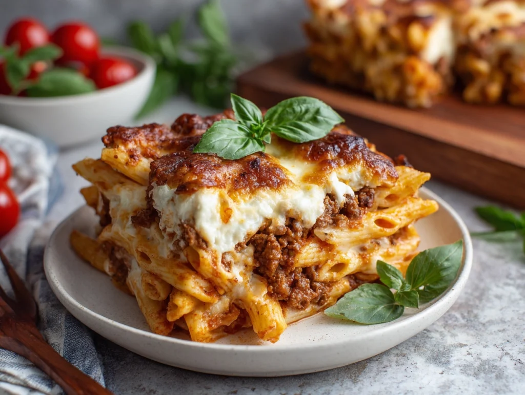 The ricotta mixture is then prepared by combining ricotta, Parmesan, and part of the mozzarella, creating a creamy layer that gives the casserole its signature texture. Once the pasta is folded into the sauce, the dish is assembled in layers sauce, pasta, ricotta dollops, and cheese before being baked until bubbling, golden, and irresistibly aromatic.