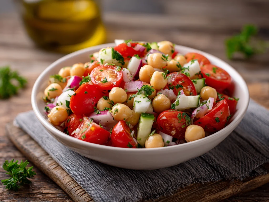 minutesThis Fresh Chickpea Salad is a colorful, protein packed dish bursting with Mediterranean flavours. Loaded with chickpeas, crisp cucumbers, juicy tomatoes, and a zesty lemon dressing, it’s light, refreshing, and incredibly satisfying. Perfect as a side dish, lunch, or healthy snack this easy no cook recipe is your go-to for any occasion.