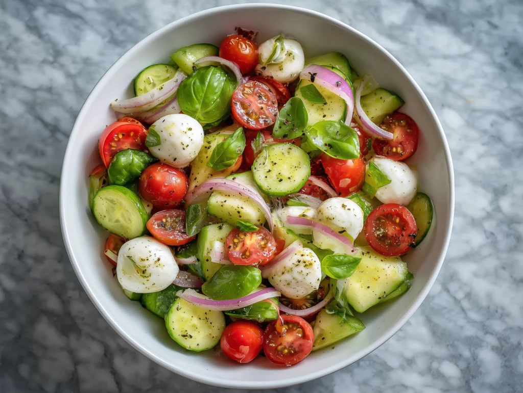 A serving of cucumber tomato mozzarella salad provides approximately 150–180 calories, with 6–8 grams of protein and 10–12 grams of healthy fats from olive oil. Carbohydrates range between 8–10 grams, while fiber content contributes 2–3 grams per serving. This combination makes it a light yet satisfying choice for health-conscious individuals.