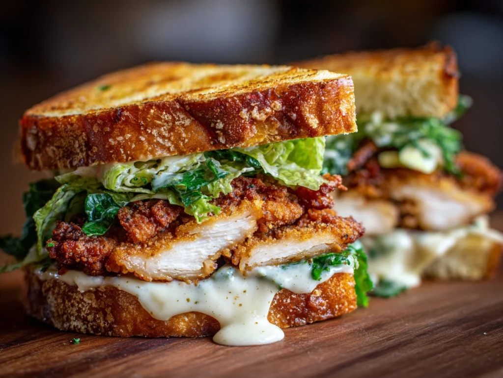 To make this sandwich, the chicken breasts are gently pounded for even thickness and marinated in buttermilk with garlic, onion powder, and paprika for at least an hour to build flavor and tenderness. After marination, they are coated in a seasoned mix of flour, cornstarch, salt, and pepper to ensure a crisp exterior. The chicken is then fried at 350°F (175°C) until golden and crunchy, and drained on a rack to keep it crispy. To assemble, toasted brioche buns are layered with Caesar dressing, romaine lettuce, and the hot fried chicken, topped with extra dressing and shaved Parmesan. A squeeze of fresh lemon adds the perfect bright finish.