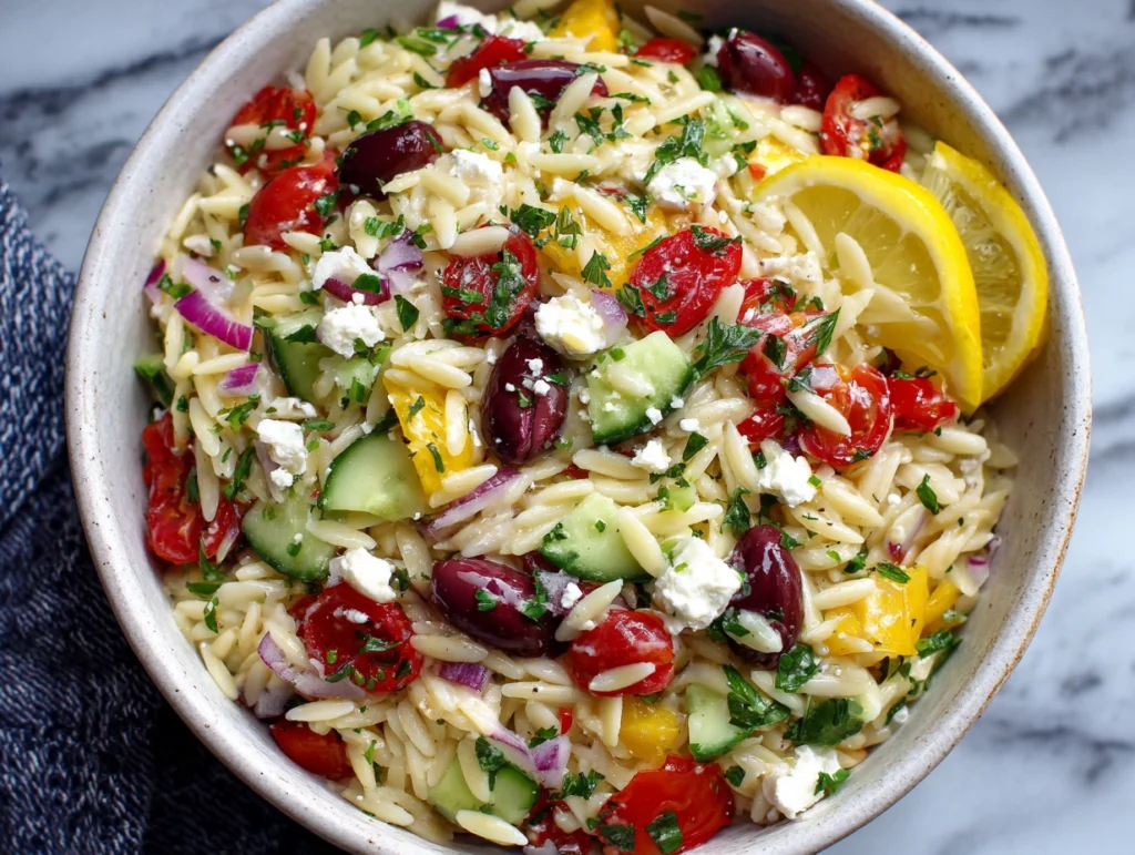 minutesThis Refreshing Greek Orzo Salad bursts with Mediterranean flavours and a zesty lemon dressing. It’s loaded with fresh veggies, tangy feta cheese, and briny olives a light, colourful, and wholesome dish perfect for picnics, BBQs, or healthy lunches.