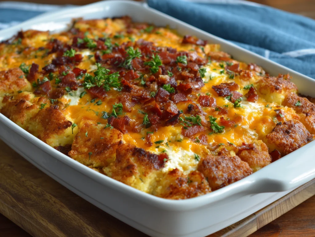 Easy Tater Tot Breakfast Casserole is a hearty and delicious way to start your day. This breakfast favourite combines golden, crispy tater tots with savoury eggs, melted cheese, and flavourful breakfast meats such as sausage or bacon. The result is a warm, satisfying, and indulgent casserole that the whole family will love. It is perfect for busy mornings, weekend brunches, or special occasions when you want a simple yet impressive breakfast dish.