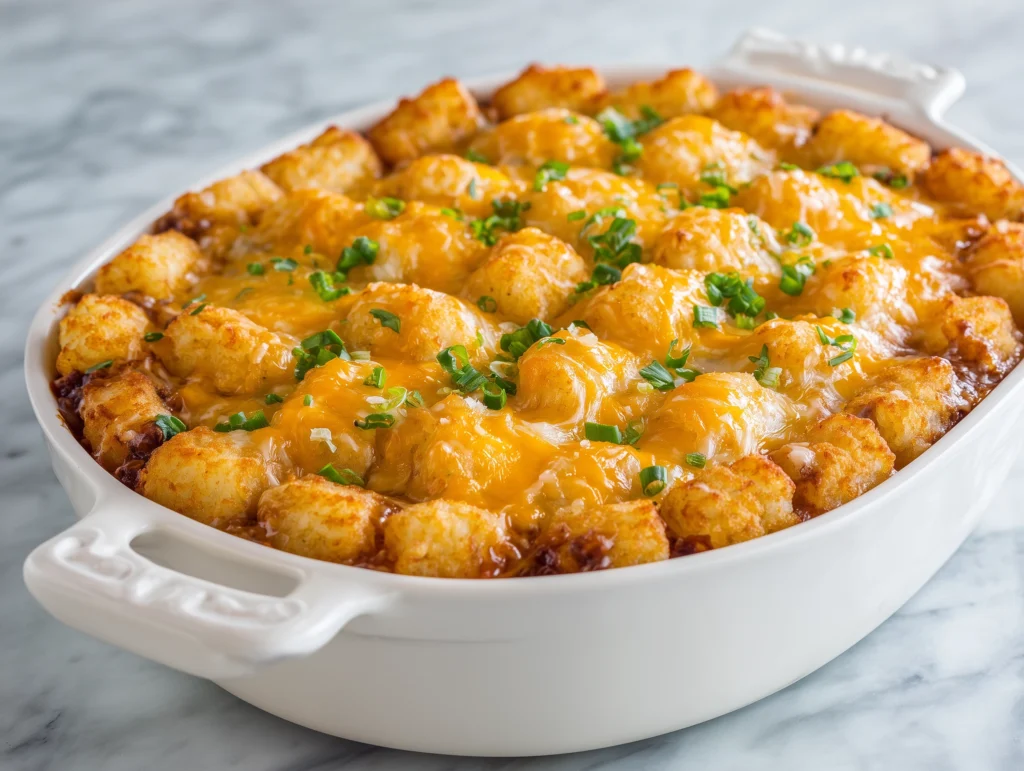 Hearty Tater Tot Casserole With Ground Beef is a timeless comfort food that combines rich flavours, satisfying textures, and simple preparation. Its golden crispy tater tots, creamy beef filling, and melted cheese create a dish that is both delicious and visually appealing, making it a favourite for family dinners and special occasions alike.