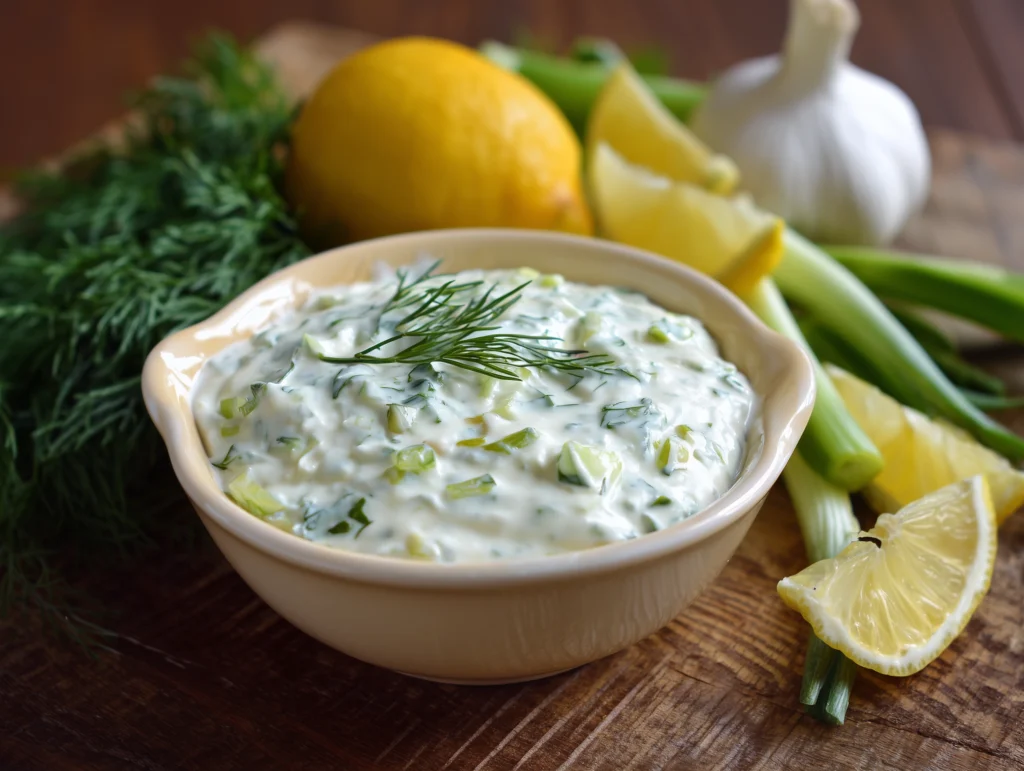 - Combine ingredients: In a medium bowl, mix Greek yogurt, grated cucumber, garlic, lemon juice, olive oil, and chopped dill.