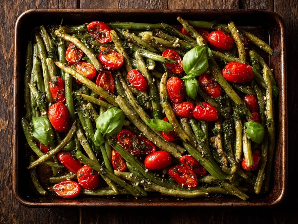 - Roast for 15–20 minutes, shaking halfway, until green beans are tender and tomatoes are slightly caramelized.