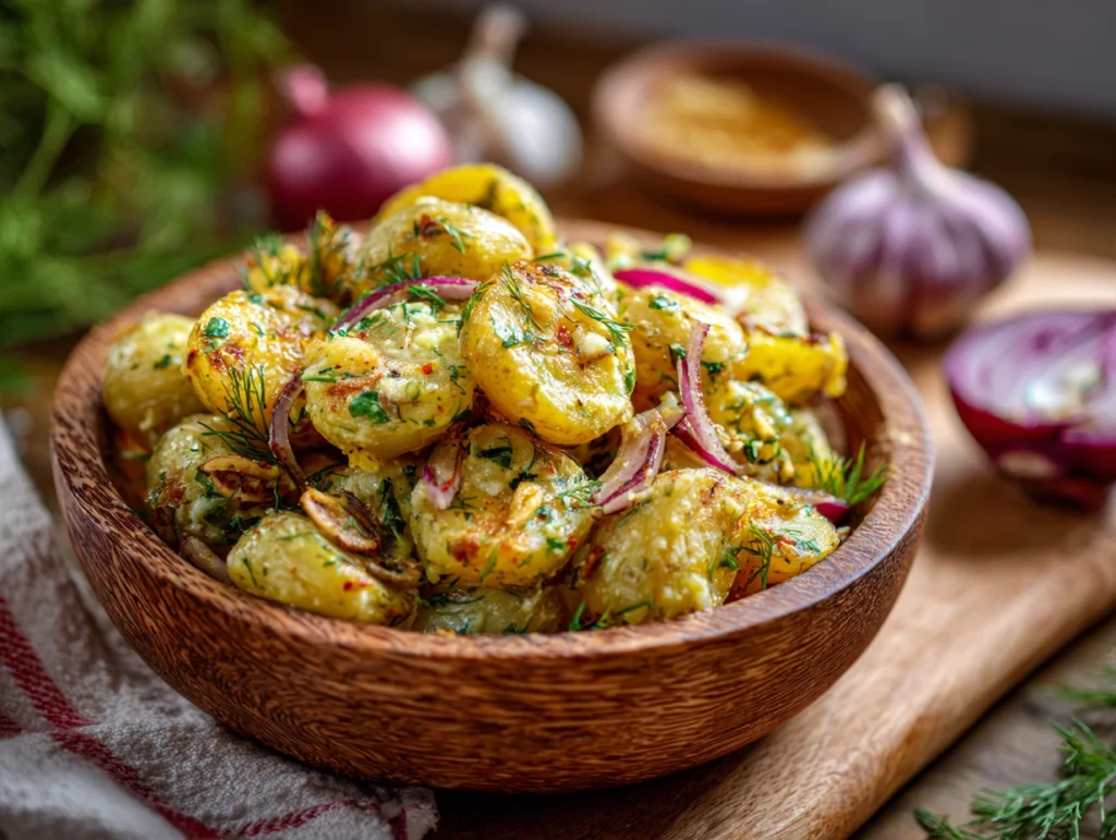 Warm potato salad is the perfect embodiment of comfort food, combining tender, flavorful potatoes with a bright, tangy dressing that awakens the senses. This dish strikes an ideal balance between rustic charm and refined elegance, making it suitable for cozy dinners, brunches, or festive family gatherings. Its light dressing ensures that the natural texture of the potatoes remains intact, creating a dish that is both hearty and refreshing. Unlike traditional creamy salads, this recipe delivers bold flavors with a subtle zest that enhances every bite.